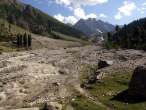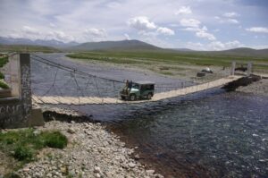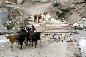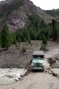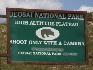 Later that afternoon, we reached Deosai National Park, where we were charged a 585 Rupee entry fee. Our guidebook described Deosai as an immense, grassy plateau bordering Indian-administered Kashmir, which is only accessible a few months out of the year. In 1993, Pakistan declared approximately 3600 square kilometers as a national park area, due to its subalpine vegetation, alpine meadows and Himalayan brown bears. One of the sign posts had a picture of a brown bear, with the logo “shoot only with camera”. Our first stop was at Deosai Lake, which we found to be extremely popular with local tourists. We munched on some delicious mangoes by the lakeside, before continuing on to our camp ground, where we erected our tents for the night. Adjacent to the campground was a low slung bridge, that looked too fragile to support vehicular traffic…it made for plenty of good photo opportunities, with jeeps crossing the bridge, mere inches away from the raging water.