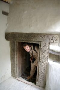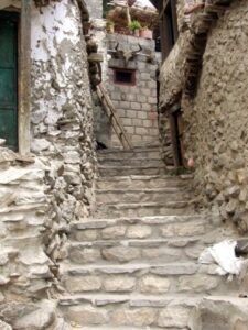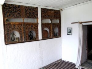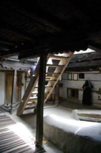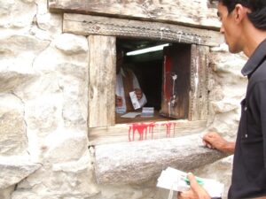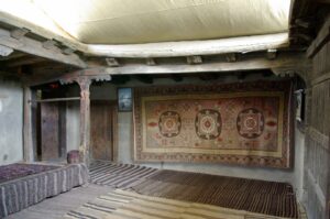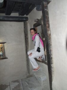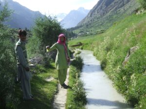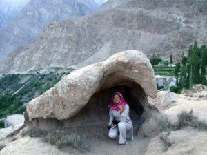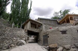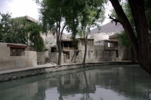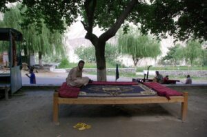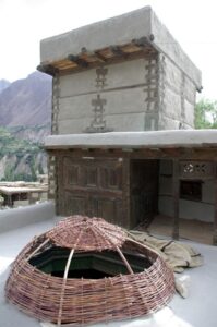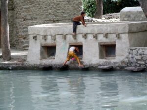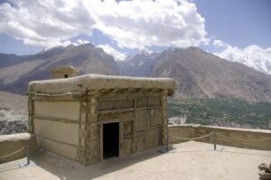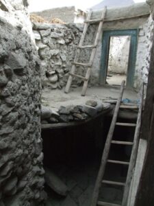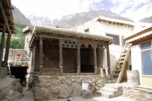 After our Baltit Fort visit (most excellent and highly recommended), we drove down to the bottom of the hill to the Ganish area of Karimabad. Zia gave us 2 choices for lodging, and we settled on the Hunza View Hotel, near the base of Karimabad. Indeed, there was no view of Hunza from the hotel, and we would have had a steep 25 minute hike uphill just to get into the old section of town, but we really liked the Hunza View Hotel. It had a funky feel to it, and combined with super friendly management, made us feel at home for the day. Robby was on a quest to find out if there was hot water, and we were assured there most certainly was so. We had some time to relax before linking back up with Zia and Jan for our sunset excursion, so we chilled out in our room for a few hours. Good thing we had some down time, as we soon realized that we had not visited the Ganish Village. Yes, we had driven through Ganish town, but had inadvertently skipped the village. Our guidebook explained that the village was a hidden gem, and was not to be missed. We confirmed with the hotel staff who explained how to get to the village, and loaded up into the jeep. Lucky of us, one of the village boys, a young man who was on college break, served as our guide and gave us a wonderful tour of his home town. We were incredulous when he explained that the outer perimeter of the village (which skirted a small pool of water), was actually part of the old silk road. He even pointed out niches in the wall where a traveler would tie up his camel and spend a few nights at the nearby caravanserai. Fascinating stuff! We could easily envision travelers tying up their horses/camels to the outer walls, stopping in at the caravanserai, and trading silk for food and shelter. Currently, the old Ganish Village consists of 31 families (down from 100 due to a flood several years ago that caused the majority of the families to seek higher ground). There were several intricately carved, wooden mosques inside the village walls, and our guide showed us the interior of a typical house (upstairs for summer and downstairs for winter). Outside the village walls, we were shown where the glacial runoff was used as an old fashioned “ice box”, where butter is wrapped up and stored underground even today! We learned so much from our young guide, who was the perfect ambassador for his lovely village.