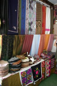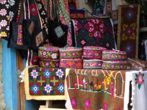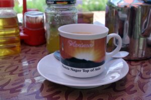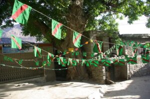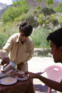 13 July 2008: We were packed and ready to go at 0800, and were pleased to see Jan and the jeep nearby, ready and waiting. Zia had already decided we would grab breakfast on our way to Hunza, so we said goodbye to the 4 View Hotel owner and were on our way. Jan pulled over at a tea house/restaurant in Rahimabad and while Zia was trying to coordinate breakfast, Becky noticed that one of the window postcards was displaying our Kalash friends. We asked the shopkeeper if we could buy the postcard but he just gave it to us once he found out we knew the ladies on display…how cool! Unfortunately, the restaurant had no eggs, so Zia advised us to press on and hold off on breakfast for a while longer. We agreed, and soon were admiring the gorgeous vista of Rakaposhi (7788 meters). Breakfast was held at the aptly named “Rakaposhi View Restaurant”, where the chefs whipped up a quick order of fried eggs, double parantha, mixed tea…delicious! The view was absolutely incredible, and we were glad that we waited to have breakfast at this location. This stop had the rare souvenir stand, and we stocked up on some postcards (10 for 100 Rupees), and glanced around at the other trinkets for sale. Becky noticed that there was lots of Lapis Lazuli for sale, one of her favorite stones. We had plenty of time to take photos of Rakaposhi, and cheered on a passing vehicle borne wedding procession before climbing back into the jeep for our onward journey to Karimabad.