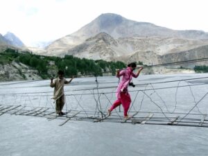 So, the next stop was the Hussaini bridge, which turned out to be the highlight of our day! Our guidebook had it right when it described the bridge as “a cluster of cables with planks and branches woven in. On a windy day it will make you feel like Indiana Jones”. It was a bit daunting to considering crossing the bridge in flip flops (some of the planks were spaced out several feet away from each other, requiring a long stretch!), so Robby suggested we walk barefoot across, as we were sure to lose our flip flops otherwise. What a neat experience! We were truly humbled when a local elderly woman zoomed on pass us, shaking Becky’s hand and urging her to be brave and cross quickly. On our first crossing, we took our time admiring the views of Passu and Ghulkin Glaciers, barely glancing down at the raging Hunza River below. However, on the second crossing, we had built up our confidence and were tackling the river crossing with ease. This was definitely a silly photo session, with all of us striking the most ridiculous poses and laughing the entire time. Zia and Jan made a 1000 Rupee bet to see who could cross the suspension bridge quicker, with Zia making it across in 1 minute 18 seconds, followed by Jan who crossed it in 1 minute 45 seconds. Its tougher than it looks, so try to race across it yourself and see how long it takes! Zia had paid a young local boy to watch our gear in our jeep as we raced back and forth across the Hussaini bridge, and sure enough, when we hiked back uphill, the boy (along with his entourage) were keeping an eagle eye view on our stuff.