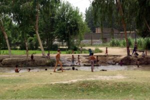 Once the police bribe issue was sorted out (Saeed kept arguing intensely against paying it and was quite adamant in his refusal), we were dismissed with a hand wave of the police and sent on our way. We were quite happy to be on the road escaping the stifling hot weather of Islamabad. No wonder that many Pakistanis who live in Central or Southern Pakistan flee to the cooler climes of the Northern Areas for some relief. We only experienced the weather in Islamabad for a few hours but it was more than enough for us! Hamid drove us on the M1 towards Peshawar and at Mardan (the spot where Robby drove us to Takht I’Bhai on our first Pakistan adventure), we veered up North towards Malakand. This portion of the drive was awesome partly because we got hours of entertainment from a nearby river that skirts the road the entire way. We saw numerous children (and some adults) jumping into the river for some summer fun to cool off, bathing, and washing laundry.