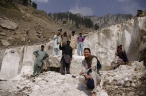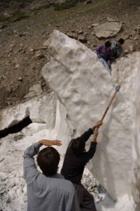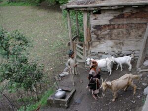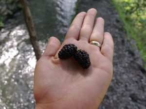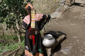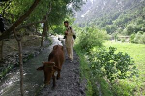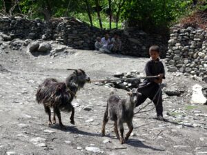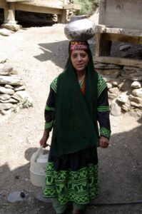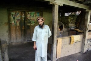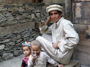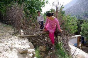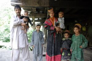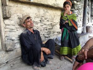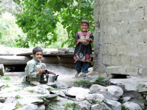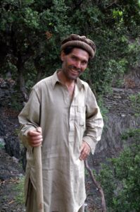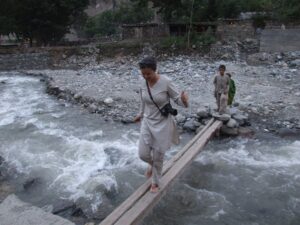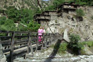 6 July: A brisk shower in the outhouse was enough to invigorate us for the day. We decided to do a quick hike around Birir Valley while our host prepared breakfast. We didn’t realize that “a quick hike” would entail walking up to the irrigation canal high above the valley, following it until we got to the outskirts of the valley, a stumble and an invitation into a Kalash family’s dwelling, a photo shoot with the friendly Kalash family, a mulberry picking session beneath an overripe mulberry tree, and a return trek back into the valley and across the wooden footbridge to the village. Breakfast consisted of dood chai (mixed milk tea), naan (traditional clay oven bread), and an omelet. Since the Kalash normally do not eat chicken or eggs, we were surprised to see that they had prepared us an omelet. After breakfast, we took some photos with our gracious hosts and promised to send them some copies once we got back home.