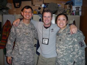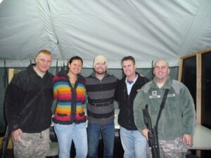 Becky poses with Max Martini (MSG Mack Gerhardt) and Robert Patrick (COL Tom Ryan) from "The Unit"; Camp Victory