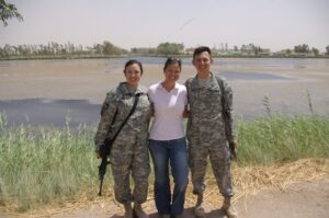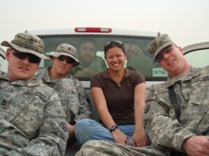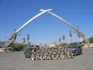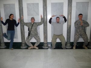 Becky with a national guard unit at the Hands of Victory monument; Baghdad
