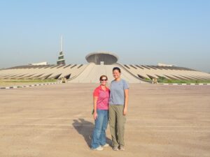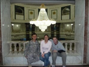 Tom, Becky & Robby posing in front of Iraq's largest chandelier; Al Faw Palace