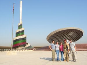 Becky, Kelly, Brandy, an Iraqi soldier, and Robby strike a pose at the Monument to the Unknown Soldier; Baghdad