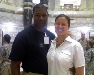 Dennis Haysbert (aka SGM Jonas Blane on "The Unit" or President Palmer on "24") poses with Becky during a USO tour; Camp Victory