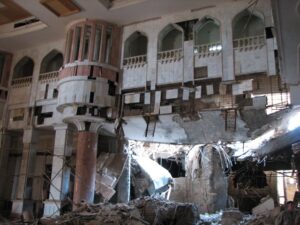 A chandelier hangs from this dome inside Saddam’s Al Faw Palace