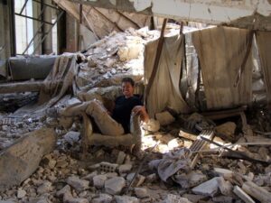 Becky strikes a pose in a "throne" left in the remnants of the Victory over America/Iran Palace