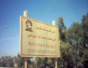 This sign sure doesn't exist anymore. Every statue or signpost referencing Saddam has since been removed