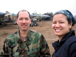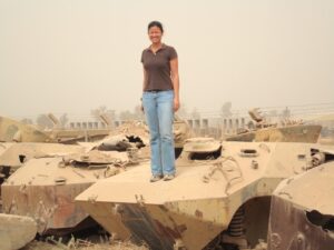 Becky on top of an abandoned T-72; Balad MiG-23 graveyard