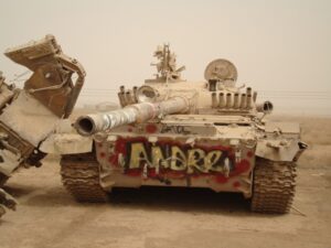 A junk yard full of abandoned T-72 tanks (soviet designed tanks that came into production from 1970 onward, and are the most widely produced post WWII tank); Balad Air Base