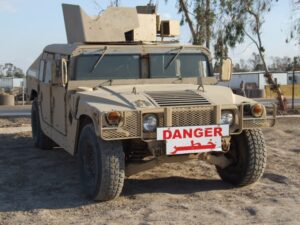 A HMMWV with a clearly marked "danger" sign in English and Arabic (so that civilian traffic does not get too close during convoys); Camp Victory