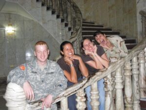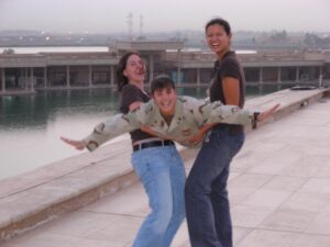 Kelly & Becky clowning around with Melissa, rooftop of Al Faw Palace