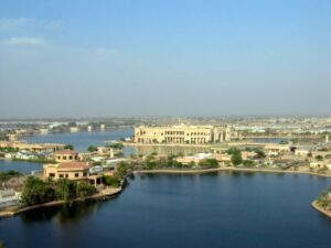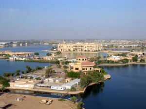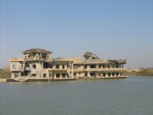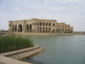 Artificial lake side view of Al Faw Palace, commissioned by Saddam Hussein to signify the Iraqi ownership of Al Faw Peninsula after the Iraq/Iran war