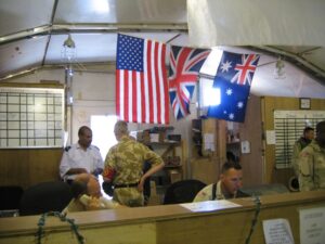 US, British and Australian flags signify the coalition forces working at this military flight terminal