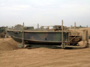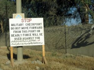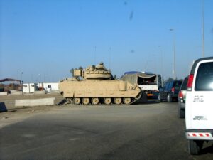 An armored personnel carrier at a military checkpoint helps to control entering traffic
