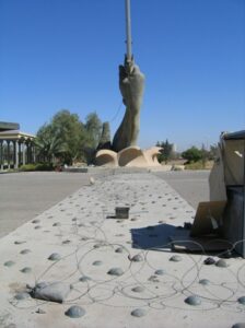 Captured Iranian helmets embedded in the ground beneath the Hands of Victory arch (apparently this was done so that the helmets would forever be "trampled" by vehicular & foot traffic); Baghdad
