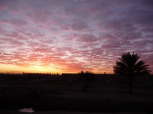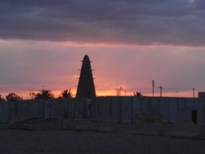 Sunset over Dodge City North, with the bat tower silhouetted; Camp Victory