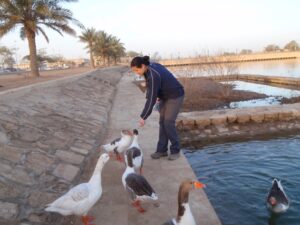 Becky feeding the Al Faw Palace geese their morning cereal; Camp Victory