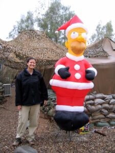 Becky next to a Homer Simpson blowup doll as soldiers decorate their living areas for Christmas; Balad