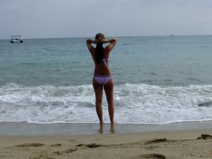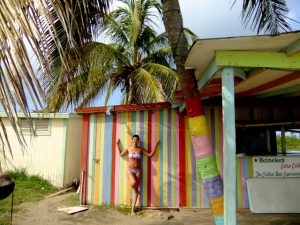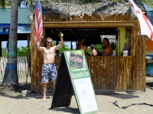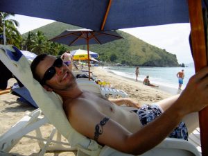 17 Mar 2010: Believe it or not but we got up early on our cruise! We were awake by 0630 and hit the gym, with Becky running a few miles on the treadmill while Robby opted for the elliptical. Self serve breakfast was fine, and we requested beach towels from our room steward, Sebastian. Today’s port of call was St Kitt’s, an island we had already visited before. So today was going to be a beach day. Armed with a bottle of rum, we were off the ship by 0800 to explore the city center of Basseterre for a few minutes in search of a grocery store to get some coke. We stopped by the tourist information office for some recommendations on what beaches to hit, and were surprised when they told us to avoid our first choice beach (South Frigate Bay) since it was supposedly lacking sand and not very big. Of course, we disregarded their advice immediately afterwards! A short taxi ride to South Frigate Bay cost $10, and we wandered down the relatively empty beach taking photos and admiring the view when we befriended some locals who persuaded us to use their chairs and umbrella for $10. They also offered a drink deal of 6 drinks for $10….deal! They loaded us up with drinks and ice and we enjoyed our self-made rum & cokes before switching over to beer. Near the edge of the pier, pelicans were dive-bombing for fish, so Becky headed out to take some photos. Very cool! The pelicans were having a field day as there were schools of tiny fish as far out as the eye could see. Perhaps it was the alcohol or else Robby was unaware of his man strength, but he snapped our beach umbrella in half trying to adjust it. He felt so bad that he volunteered to give Becky’s Celebrity bag away, and gave a $10 donation to ease his remorse. In any case, we had a wonderful time at beautiful South Frigate Bay and have to disagree with the tourist information office staff who told us to avoid this beach. Our taxi driver on the way back to port was hilarious, dancing a little jig for us in the parking lot along with his buddy. The sun in the Caribbean is no joke, and Becky definitely got a bit too much of it today. C’est la vie!