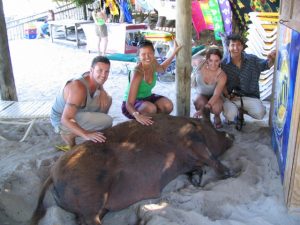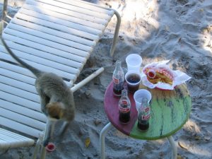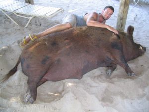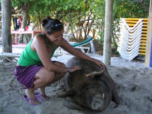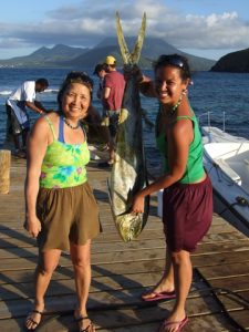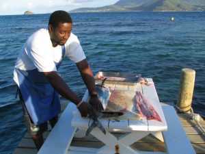 We were wondering if we were heading in the right direction to get to Turtle Beach Bar & Grill because the eastern half of the island is pretty desolate. Once we caught a glimpse of the Great Salt Pond, we knew that Turtle beach was just around the corner. We were greeted by our super friendly hostess, who beckoned us to a breezy corner table with a fine view of Nevis and the bay. After our late lunch orders were placed (conch ceviche, fresh mahi), we had to fight off the cheeky green vervet monkeys who were brashly hopping nearby our table trying to swipe a quick bite of French fries. Our waitress showed us an ingenious trick. The vervet monkeys are scared of frozen ice. Armed with a pitcher of ice, we watched as she flung ice cubes towards the monkeys who dispersed in fear. Our late lunch hit the spot, and afterwards, we dispersed to enjoy the facilities of Turtle beach. Some of us lounged in the chaise chairs by the beach, while others befriended Wilbert, a massive boar who weighs over 500 lbs. Some fishermen had returned with their catch of the day, and they proudly displayed their trophies on the pier. The kitchen’s chef hurried down to the waterfront to carve up the fish into fresh steaks, and fed the scraps to the massive stingrays hovering just below the dock.