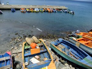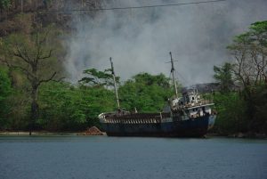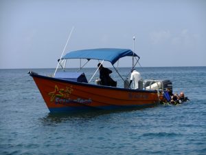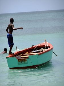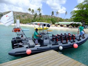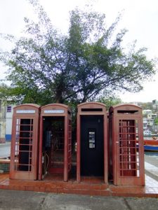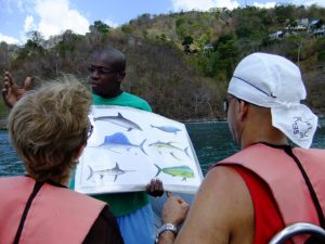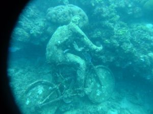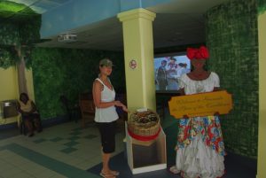 We met Susanne from Seafaris at 1245, and met her husband Howard and his helper, Albert. The RIB (rigid inflatable boat) was awesome…we got in, strapped into our vests and were zooming off. What a smooth and fun ride! Howard was the perfect host, as he sped us along the western coast of Granada towards our first stop, an underwater sculpture park. It was awesome, as we had tons of time to snorkel amongst the sculptures, and saw some colorful fish, squid, lobster, eels, culminating in being surrounded by greedy Sergeant Major Fish that swarmed us at the end of our session. Two thumbs up…Albert was our underwater guide and he was very patient, guiding us through the major sites. There was an underwater ring of children, carved faces, laying ladies, a bicycle rider, and “the correspondent”, (complete with laminated news articles about Granada!). After our snorkel session, Howard took us over to a black sand beach (hot hot hot in the summer) and we got a nice view of the western side of Granada. Curiously, we saw smoke rising in the distance, and Howard told us that it has been unseasonably hot and forest fires had broken out all across the island. In fact, his son’s school had been evacuated the week prior, and that was located right in St George! On our return trip, we stopped off at St George where Howard gave us a brief history lesson on the harbor actually being the site of an old volcano basin, filled with a fresh water lake 200 years ago. It was joined to the sea so that boats would be allowed safe harbor. Since we were the only two cruise passengers, Howard dropped us off first, playing “Grease Lightning” while speeding in circles in the harbor..lots of fun and a very nice excursion. We thanked both Albert and Howard for the good times and agreed that Granada had turned out to be our favorite island so far.