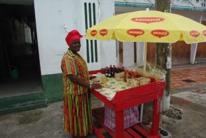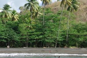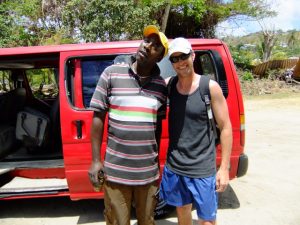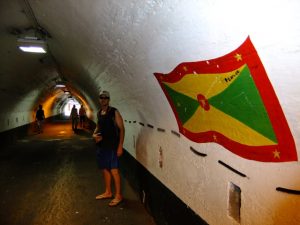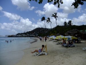 Entrance to Ft George was $2, and we later found out that if we had walked up the rear entrance (by the police academy), we could have entered the grounds for free! Oh well, live and learn. The weather hadn’t made up its mind whether it wanted to be nice or naughty, so it sprinkled one minute and saturated us with sun the next. We briefly debated whether to head back to get our rain jackets, but Robby felt that the rain would be brief (he was right). We walked over to Caranage, the scenic harborfront of St George. The Marryshow House was listed on our map as one of the city’s highlights, so we wandered around until we found it. Today it is a University of the West Indies, with an active folk theater. The back streets of St George were tourist free, and we could see some of the devastation that Hurricane Ivan wrecked several years ago. Three churches in the city lost their rooftops, and were undergoing renovations. A couple of colorful fishing boats caught our attention, so we headed down towards the fish market (closed because today is Sunday), and saw the colorful assortment of vessels tied up to the dock. We wanted to head back towards the Caranage section of the city, and found the 1894 “Sendall Tunnel” to take us there. A jovial tour/taxi driver named Soulja Boy caught our attention and convinced us to take his $10 tour up to the nearby waterfalls to see some monkeys followed by a refreshing dip, a spice plantation and a visit to Grande Anse Beach. It seemed to be a bargain so we agreed and piled into his van, meeting 3 other Germans who had agreed to the same tour. We had made it clear that we needed to be at Grande Anse by 1 pm, as we had another tour waiting for us there. However, Soulja Boy’s sidekick was more intent on getting more passengers for the tour, and we wasted half an hour trying to convince other tourists to join us. With the clock ticking, we decided to take a water taxi to Grande Anse Beach (US$4 per person, one way), where a 2 mile soft sand beach awaited us. Much to Becky’s chagrin, she realized that our beach towels had been inadvertently left in Soulja Boy’s van….dammit! Well, the only thing going for us was that we knew the beach stop was part of Soulja Boy’s itinerary, and we were hoping that we’d be able to link up with him there. In the meantime, we relaxed at the bar at the Coconuts Beach Restaurant, where we ordered some drinks while we waited for our afternoon excursion with Seafaris. Happily, we ran into Soulja Boy and he actually seemed happy to see us, stating that there was no hard feelings when we ditched his cab. He returned our lost bag and we bought him a beer. Good times…we’d love to link up with him again…such is the hospitality and kindness of the Grenadians, whom we found to be very friendly and honest people.