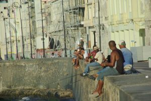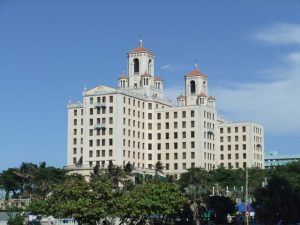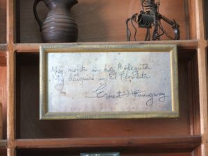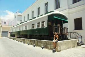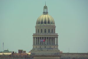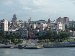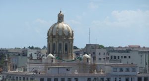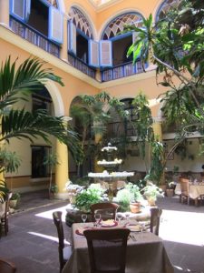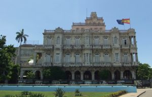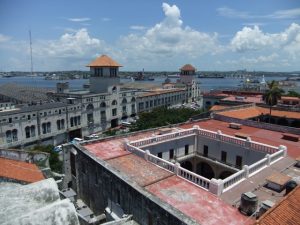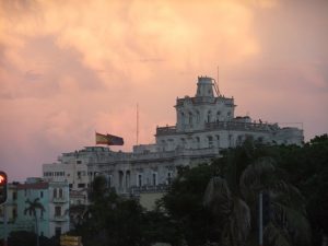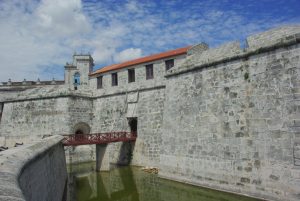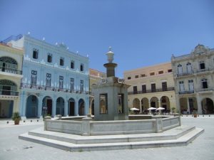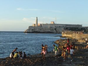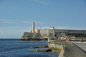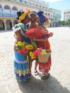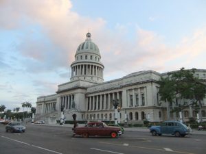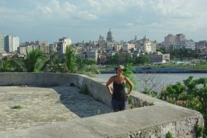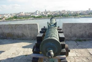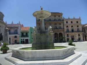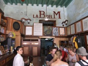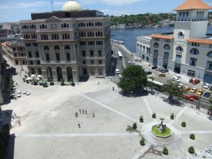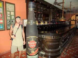 17 Jun: Woke up and had breakfast of omelets with ham/cheese which were delicious! First agenda today was to exchange our Euros to CUCs, and we found a cadeca that offered us a rate of 1.10. After exchanging all of our cash into CUCs, we returned to the hotel for safekeeping of our bundle of CUCs before heading over to Plaza de Armas, which incidentally is Havana’s oldest square. Robby was immediately accosted by colorfully clad ladies clamoring for a photo and we obliged, thrilling them with a 1 CUC payment afterwards. Well worth it to see Robby attempt to scrub some strong lipstick off his scrubby beard afterwards. We later visited the Castillo de la Real Fuerza, the oldest existing fort in the Americas. There was a book fair being held at the Plaza, and we strolled by the Museo de la Ciudad which was packed with tourists. An inside courtyard had a white marble statue of Christopher Columbus and the entry portal was quite ornate. From Plaza de Armas, it was a short walk over to the Plaza de la Cathedral, and we saw a pretty model in a bright yellow gown being filmed at various locations around the plaza. Of course, we did the obligatory pass by of one of Hemingway’s favorite watering holes, but it was way too crowded with tourists so we headed back to the Plaza de San Francisco, climbing the church tower for a nice view over the city. Afterwards, we visited the Havana Club Museum of Rum, (Museo del Ron) which was OK but a bit overpriced at 7 CUC (the “free” sample was a tiny shot of the 7 year old aged rum). Afterwards, we went to the Plaza Vieja and took an elevator up to the Camara Oscura, which had “live 360 degree views” of the city. It had been a busy day, but we still managed to wander back towards the Capitol and the Prado, stopping frequently to admire the gorgeous architecture. At the edge of the malecon, we both imbibed in our bottles of Havana Club rum, and of course got a little bit tipsy.