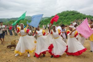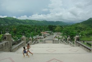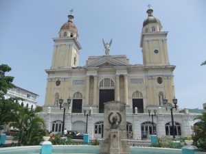 7 Jul, Santiago de Cuba, El Cobre: We woke up and had no major plans today except to visit the Emilio Bacardi Museum and El Cobre. So we slept in till 9 am, and enjoyed a late leisurely breakfast on Sandra and Paco’s patio. After breakfast, we relaxed until about 1 pm, and talked briefly to Sandra’s friend on what time we wanted dinner (1930) and what we wanted to eat (shrimp) since both Sandra and Paco were out and about. After four busy days in Santiago, we had finally realized that we were making an extra loop each time we headed towards Parque Cespedes, and cut out the extra hill climbing by taking a more direct route (and bypassing the Padre Pico staircase). The Emilio Bacardi museum was a bit cluttered and no photos are allowed. The bottom floor has a rather oddball assortment of exhibits (weaponry, shrunken heads, Peruvian skeletons and pottery), while the upstairs serves as a gallery for an eclectic range of artwork. Afterwards, we met our taxi ride and found out that our go to guy had to get his car repaired, so he handed us off to his “cousin” who would take us to El Cobre for the same price we had agreed to the day before (25 CUC including wait time for the festival). We dutifully piled into the yellow, decrepit Lada at 1500 and visited the Basilica del Cobre first. It is located about 12 miles from Santiago. The region of El Cobre was once famous for its copper (hence the name “Cobre”). The basilica is famous for housing the statue of the Black Virgin, declared the Protectress of Cuba since 1916. Visitors can gain access to the diminutive but highly revered statue by entering from the rear of the Cathedral and climbing a staircase to a viewing area. We saw lots of locals bringing flowers to lay at the viewing area before the Virgin Statue, praying in silence in the pews before her. We found out that Pope John Paul II visited here in 1998 and blessed the Black Virgin. She is dressed in yellow and wears a gold crown encrusted with diamonds, emeralds and rubies. It didn’t take long to visit this complex, and afterwards, we drove to the old mines of El Cobre where the slaves were forced to work at a place called “Loma del Cimarron”. Lucky for us, tonight as part of the Festival del Fuego, there was a religious themed show to pay tribute to the slave rebellion at the Loma del Cimarron Monumental Complex. Our fiesta schedule indicated the performance was supposed to start at 1600, but as 1700 rolled around, we realized that it would actually be closer to 1800 when the festivities would kick off. We were only able to catch about an hour of the show, but it was well worth attending, with lots of colorful costumes, dance and songs in such a historically significant location. It started pouring down with heavy rain on our ride back to Santiago, and we were happy that our cabbie offered to drop us off at the casa (he had slyly offered to take us to the Viazul bus station at 0700 sharp for 5 CUCs). He wanted to do a recon to figure out where we were staying and it worked out well for us, as we would have gotten a severe drenching if we had done the usual walk back from Parque Cespedes. Our shrimp dinner was excellent…boy can Sandra prepare a mean dish! We are going to miss her good old fashioned cooking, and definitely enjoyed our casa in Santiago.