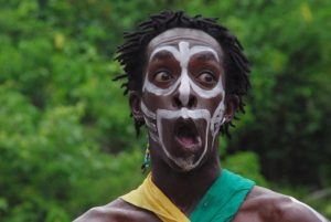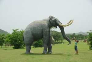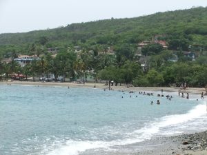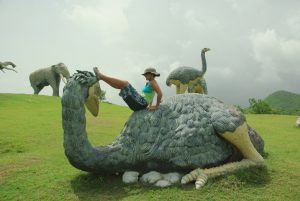 5 Jul, Santiago de Cuba, Playa Siboney: Sandra had proudly created an American style breakfast for us, a la grilled ham and cheese. It was actually quite tasty, making for an interesting and fulfilling meal. Our plan today was pretty chill, with our only intention to relax at a nearby beach, Playa Siboney, and catch the opening parade for the Fiesta del Fuego later that afternoon. We were a bit early to meet our prearranged taxi at our agreed upon meeting point at 0930, but after waiting almost 15 minutes after he was supposed to meet us, we ended up going with another cabbie who was fastidiously rubbing down his vintage automobile with a lot of TLC. He agreed to the same price of 25 CUC round trip including wait time. Playa Siboney was quite the pleasant day trip from Santiago, with lots of shady trees and a beautiful soft sand black beach. We agreed to four hours of bliss here, before linking back up with our driver at 2 pm to head towards a prehistoric park (Valle de la Pre Historia) that he suggested as an extra excursion. Cubans started flocking to Siboney later in the day, and soon loud music was booming from a nearby stand, making for an interesting beach experience. We dipped into the clear waters to cool off, and found the shady trees a perfect retreat from the beating sun. Four hours here zoomed by, and we were off to the prehistoric park, which was actually quite hilarious. Massive concrete sculptures of dinosaurs, woolly mammoths, rhinos, and a myriad of other interesting characters were spread over several acres of pristine land. We later found out that prisoners from a nearby prison had worked on these figurines, and it was definitely a bizarre visit. We were back in Santiago by 4 pm and dropped our bags off at the casa before rushing back out to get to the start of the “Parade of the Serpents”, this year’s theme for the opening parade of Fiesta del Fuego. The parade actually kicked off closer to 6 pm, and we watched as thousands of participants clad in their respective countries traditional outfits marched down the street, starting at Plaza Dolores and culminating at Parque Cespedes. We met so many lovely performers and were quite surprised when several of them invited us to their respective after-parties at several of the clubs in town. It was a fun, festive and colorful affair, and we took countless photos before the finale. Since Sandra had prepared chicken for dinner, we headed back to our casa and stuffed ourselves silly. Another great day in Santiago!