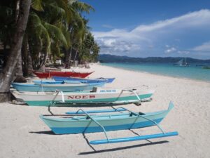 Traditional outrigger boats line the pure white sandy beaches of Boracay
