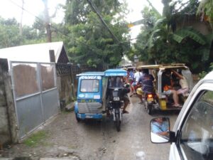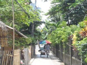 An umbrella covered tricycle navigates down a narrow alley; Boracay