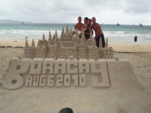 Carrying Chi Xuan in front of the Boracay beach castle on our last day on this pretty island