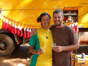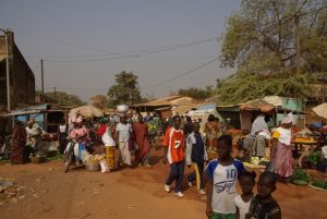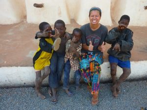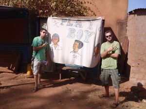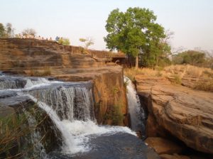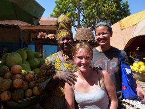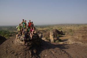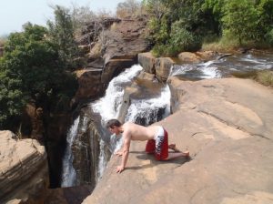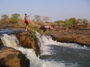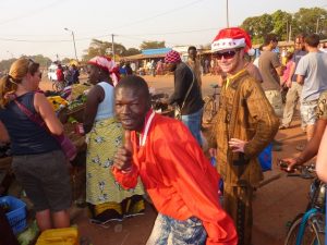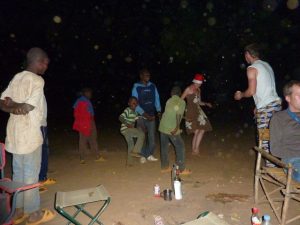 24 Dec: MJ lost her silver ring, but Lucky spotted it in a stroke of luck. We ate breakfast and had a short drive to Banfora, where Nancy asked for helpers to assist in carrying some bags from the market. Here, we stocked up on last minute Christmas day food supplies, getting essentials such as bread, tomatoes, lettuce, etc. It was also our last chance to stock up on alcohol before the Christmas festivities. We had an hour of free time so we stocked up on coke (12 bottles for 4000 CFA), and one bottle of cheap rum (4000 CFA). After taking a few photos of the market, we loaded on the truck for our short ride towards the Chutes de Karfiguela, a series of wonderful waterfalls about 20 KM from Banfora. This was a holiday surprise as we had not heard of a waterfall Christmas! The scenery was spectacular and we enjoyed seeing the fields of sugarcane. It is much greener in Burkina Faso as compared to Mali. Lars and Becky sat on the beach and had to duck at the low branches, but had phenomenal views of the countryside. We eventually pulled up into the parking lot of Karfiguela, and was that we’d be able to camp in the small hut enclosure area. However, everyone was keen on checking out the waterfalls so we walked down the path leading to the falls, past massive mango trees. There was a short steep hike to get to a wonderful view point, and a nice wading pool. After having reconned the area, we vowed to return after lunch, armed with DEET, swimsuits, towels, and sunscreen. But first, we had to set up our tents and we chose a shady tree (with neighbors of Bree and Lucky, Matt and Lars, and Norma and Pam). The afternoon was bliss, as we enjoyed our drinks in the pool, washing our hair beneath the falls and loving the views. A natural infinity pool was discovered, so we took quite a few photos there before a group descended before sunset. Becky, Dowelly and Bree (along with new love birds of Lars and Marie) decided to stay up to see sunset, before making the descent back into camp where we enjoyed a double salami pasta dinner. Unfortunately for Becky, she ended up throwing up her dinner shortly afterwards, and was feeling quite unwell. However, she still managed to stay up late enough to watch as Ruth and Sara built up their legion of fans with a dance off, making for wonderful entertainment for the local kids who had perfected their dance moves and could expertly mimic almost every dance move they were taught. Lucky eventually dragged us out onto the dance floor and it was a great Christmas eve, with everyone in high spirits celebrating the holidays.