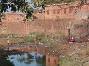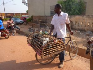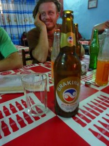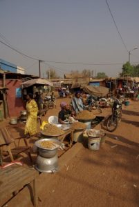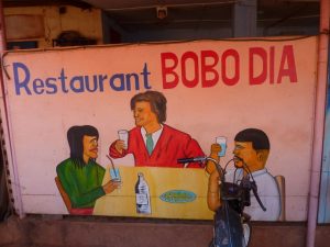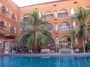 27 Dec: After having leftovers and oatmeal for breakfast, we packed up and were on the road by 8 am, heading for a nearby attraction, the Domes de Fabedougou. These fabulous rock formations were created long ago, and we hiked up to the top of one for a phenomenal view of the countryside. It was a nice treat to have an hour admiring the vistas here, and afterwards, we had a short truck drive to Bobo-Dioulasso, where we pulled into CasaAfrica, our home for the next two nights. Chris accidentally hit the gate coming in but he did manage to squeeze Nala into the miniscule courtyard, where we set up our tents. Nancy told us that we’d need about 40,000 CFA for visas, and told us to budget for 2 meals in Bobo, and one meal in Togo and Benin. Armed with that knowledge, we had to figure out how much extra money we had taken out, and found to our dismay that Robby could not find out where his wallet was. After emptying out our locker, we found it in a plastic bag, but it was a disconcerting feeling to think we had lost our money and credit cards! We joined Sara, Sean, Hoff and Dowelly into town for lunch, and we ended up finding a great shack for lunch near the grand marche, in a popular restaurant called Restaurant Bobo Dia. Becky loved her steak and fries (bargain priced at 1000 CFA for the steak and 750 CFA for crispy fries) and Robby thought his pepper steak was great too. Beer around the pool at Hotel L’Auberge was fun, and Hoff got pushed into the wonderfully inviting pool by Sean after he commiserated all afternoon how much he’d love to take a dip in the pool! We headed back to the campsite around 4 pm, and just lazed around until dinner. There was one electrical outlet so we decided to charge our batteries and download photos.