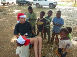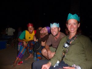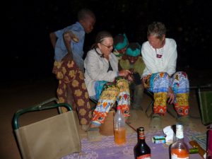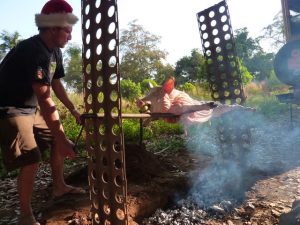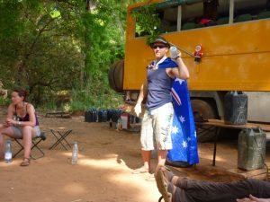 25 Dec: Merry Christmas! We had breakfast at 0830 followed by Secret Santa presents. The pig was put on the spit early (her name was Jemimah) and Lucky even painted her nails! Secret Santa was fun, with everyone stealing each other’s presents. The favorites were a 15 minute Lucky massage, a pretty pink scarf with Sharks (yummy candy), and super soakers. It took a while to get through 25 people but eventually the presents were all sorted out and Mike got his Automotive Book back (it had apparently been stolen the day before). Folks were drinking early, with champagne and OJ to beer and wine (at 9 am!). We kept trying to remember that today was a marathon and not a sprint, and decided to space out our drinks. Since the focus of today was to enjoy each other’s company, we were reluctant to ditch the group and head up to the falls so we tried our best to hang around the spit. Lunch was a smorgasbord of finger food (muscles, crackers, hummus, salami) and the crackling from the pig was ready at 3 pm and devoured. We decided to join Goodie, MJ, and Dowelly for a quick dip at the falls before dinner, spending a quick hour up there exploring further upstream. Becky, Lucky and Robby weren’t feeling 100% for dinner, so the highly anticipated dinner of pork was skipped. However, Robby did a 180 immediately after dinner and started drinking heavily, apparently he got over his nausea rather quickly! Poor Lucky and Becky were down for the count early, but everyone else stayed up late partying with drinking games. Sometime in the night, Dowelly’s tent was pulled down (with Goodie in it) and MJ ended up puking for the first time in over 2 years! Everyone blamed it on too much “Monkey Tang”, which was Lar’s latest concoction of Mint Vodka and Tang.