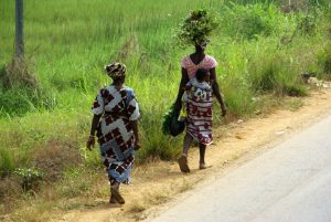 Artwork depicting a typical scene of women carrying a load on their head and a baby strapped to their back