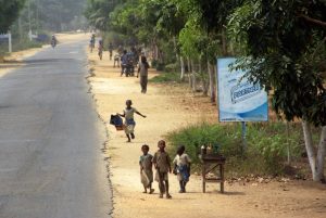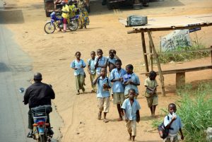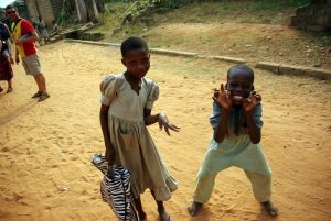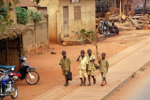 Local boys walking home from school are amused by our big yellow truck; near Ganvie Lake Village