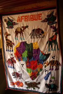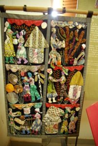 A patchwork quilt showing an African wife being kicked out of her home when her husband takes on a new wife; Women in Africa exhibit at the Maison du Bresil