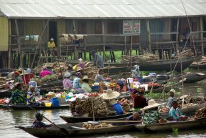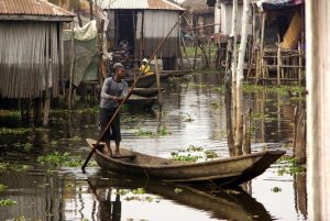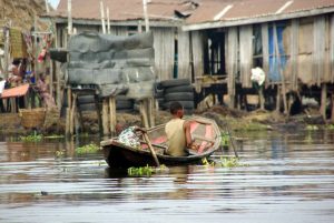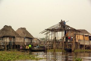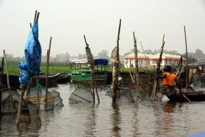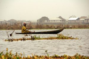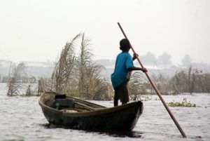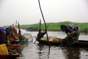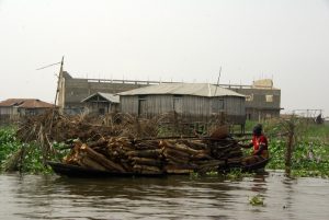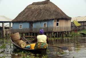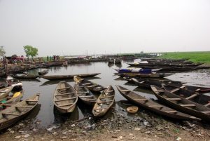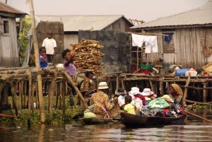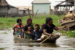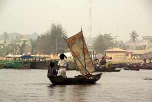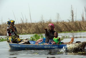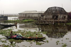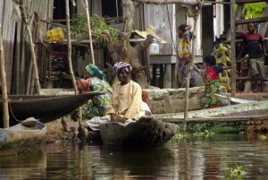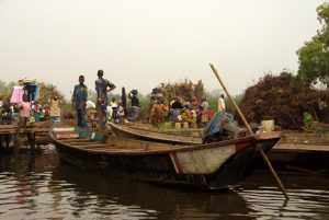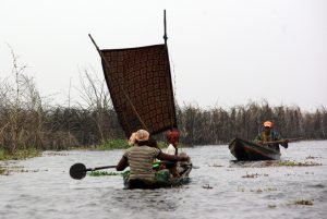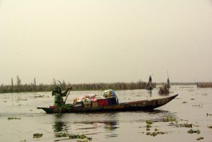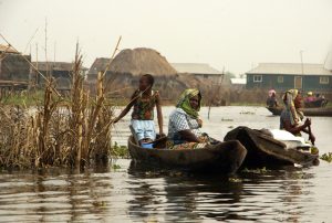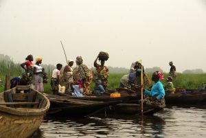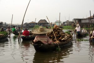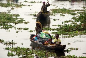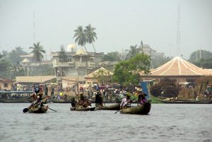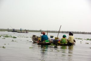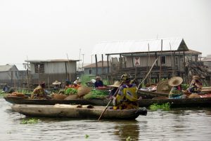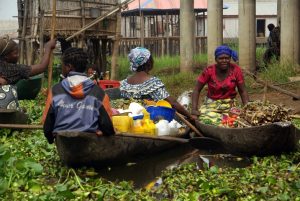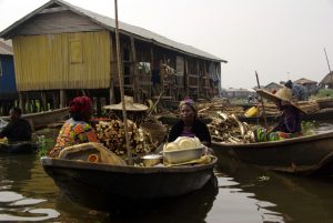 Locals making their way to the floating market to stock up on goods; Ganvie Lake Village
