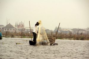 A fisherman steadies himself to throw his fishing net while balancing on his pirogue; Ganvie