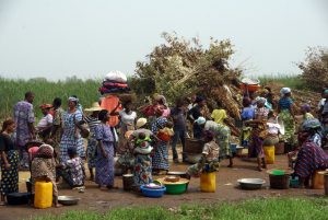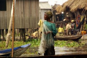Ladies setting up a fish market at the entrance to Ganvie Lake Village