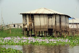 The purple water lilies growing just beneath the stilt homes in Ganvie make for a picturesque image