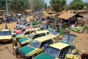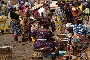 Ladies crowding up to sell their goods at the Ganvie floating market