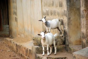These pigmy goats were head butting one another but took a brief pause to pose for a photo; Ouidah