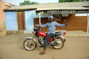A friendly local man stops his motorcycle to pose for a photo and then continues on his way; Ouidah