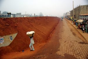 A lady struggles to carry a heavy burden; Route des Esclaves