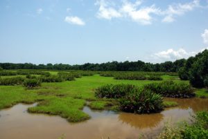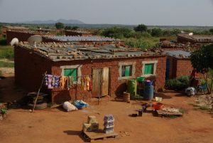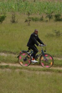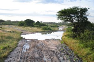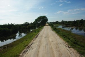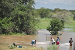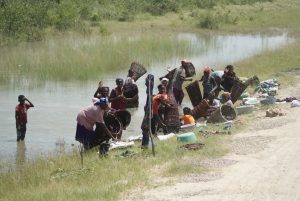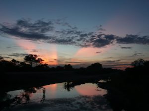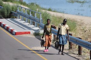 15 Mar: Breakfast at 5:15 with our usual 6 am departure. We had a brilliant sunrise which warranted a few predeparture photos. It was a rough road and we got stuck in a mud hole at 8 am. Everyone got off the truck and armed with shovels, we scrounged around for rocks to fill in the hole. After twenty minutes worth of sweaty labor, we were able to get the truck unstuck and continued on our way. At around 9 am the road improved and we drove to a gas station in Ondjiva. After that, the road deteriorated again and there were wetlands on both sides of the road along with people fishing with baskets, making for picturesque scenery. Finally, the border crossing at Santa Clara was in sight, and much to our delight, we found out that we would be able to cross with no penalty fee from Angola for being late (apparently our 5 day transit visa consisted of 5 x 24 hour periods to cross the country so technically, the morning of the 6th day, we were still considered on time).